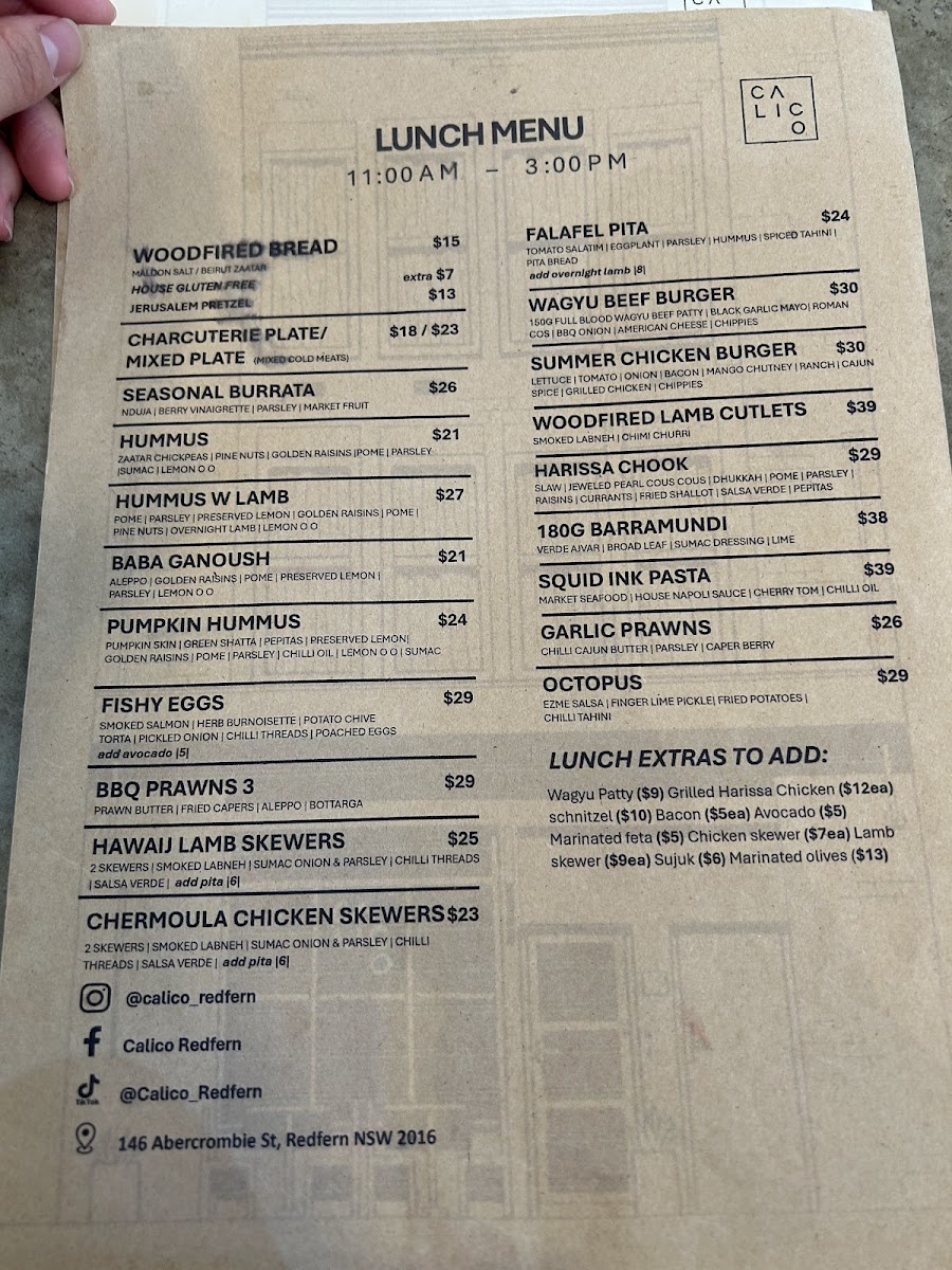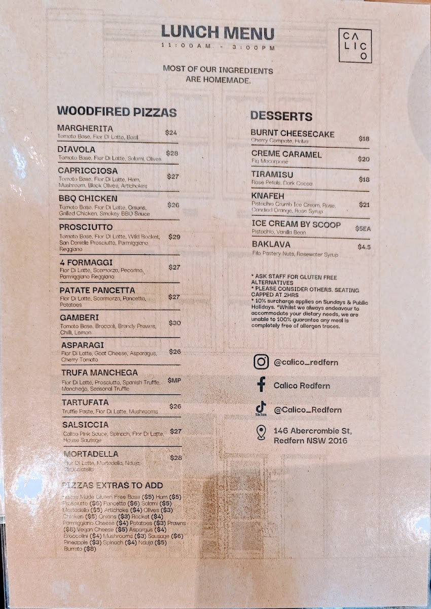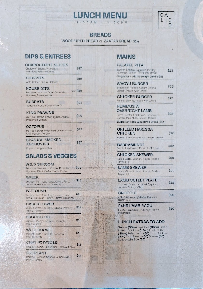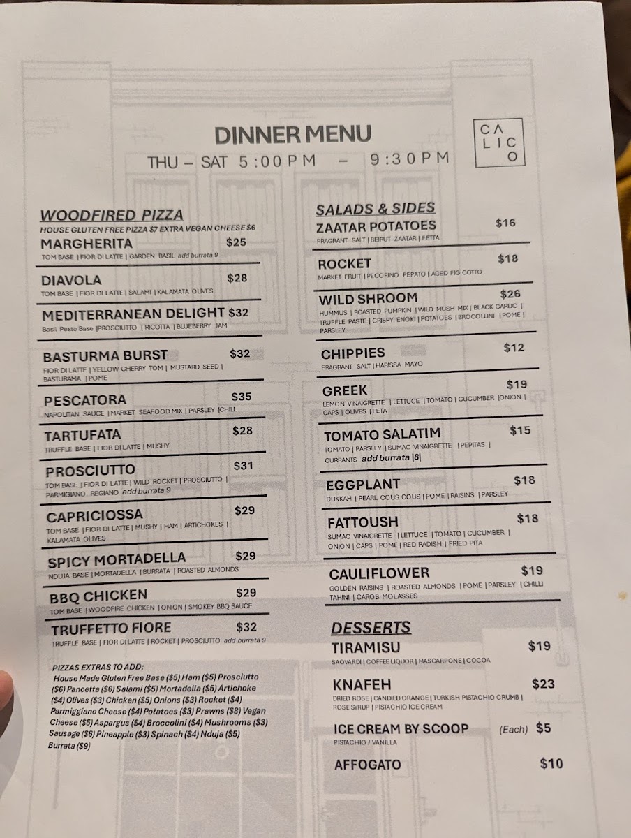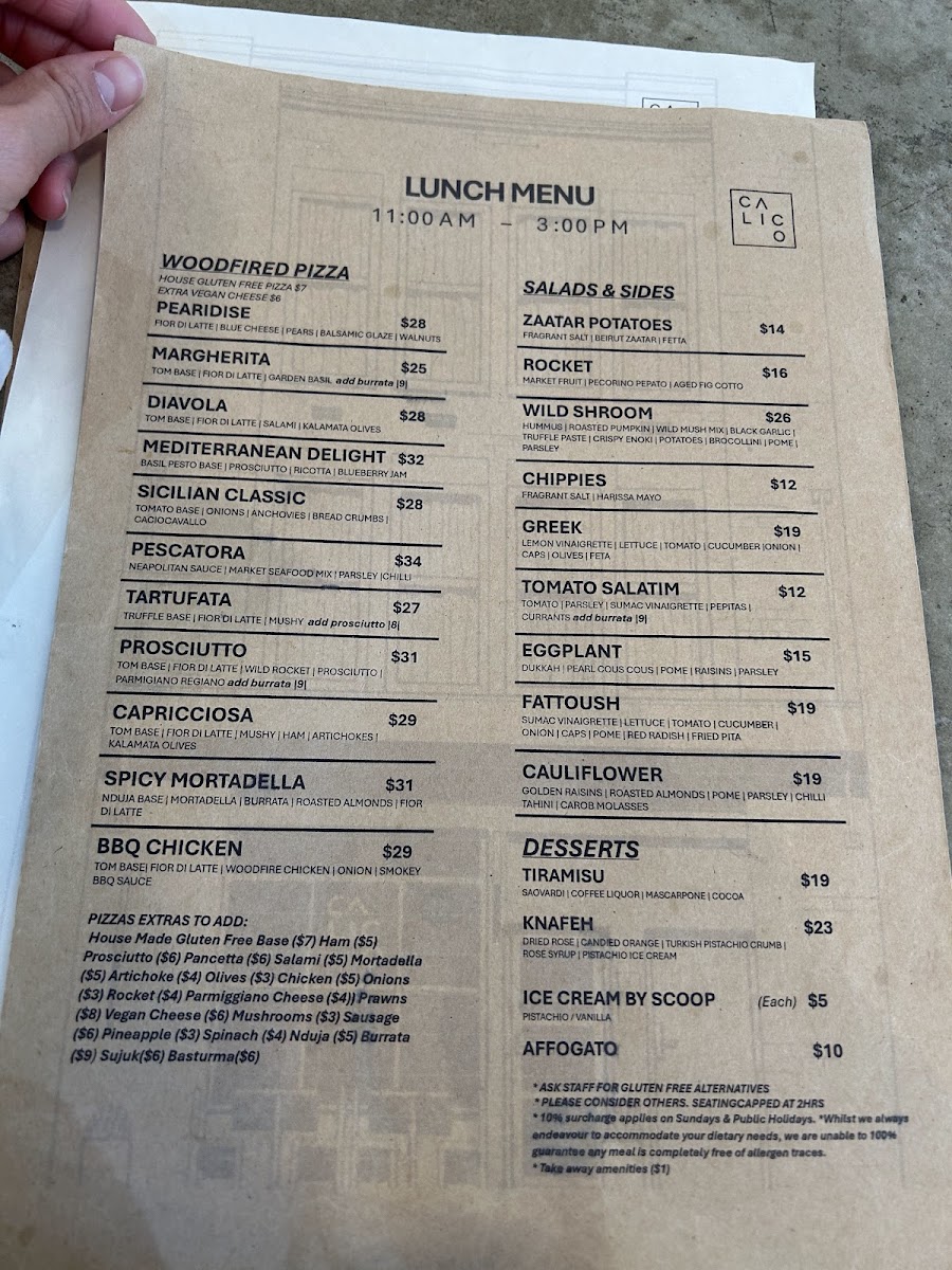 From starters to mains, Calico’s menu impresses with a delightful range of vibrant options that celebrate woodfired and fresh flavours. At lunch, guests can enjoy Woodfire Bread, Fresh Charcuterie Slices, and house dips alongside creamy Burrata and succulent King Prawns, followed by veggie highlights like Wild Shroom, Greek, Fattoush, Cauliflower, and Broccolini. The woodfired pizzas - Margherita, Diavola, Capricciosa, BBQ Chicken, and Prosciutto - offer classic and bold toppings, while desserts such as Burnt Cheesecake, Crème Caramel, Tiramisu, Knafeh, and Ice Cream by Scoop provide a sweet finish. Breakfast features hearty choices like Israeli Pita Bread, Sourdough, Jerusalem Bagel, Fruit Toast, and a Smoked Salmon Plate, with extras like Grilled Tomato and Roasted Mushroom to customise your meal. Takeaway options include the Smoked Tuna Roll, Mortadella Buffalo Roll, Ham Cheese Croissant, and Ham Cheese Toastie. Dinner returns to shareable starters like Hummus, Pumpkin Hummus, Baba Ganoush, and Taramasalata, leading into mains such as Chicken Baharat, Lamb Shoulder, Woodfired Whole Fish (Barramundi), 24‑Hour Lamb Ragu, and a Lamb Cutlet Plate, rounding out a menu that feels both thoughtfully curated and full of character.