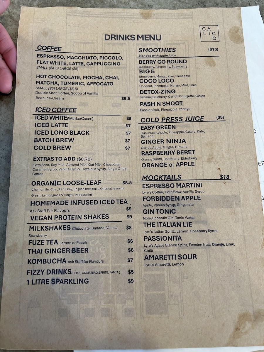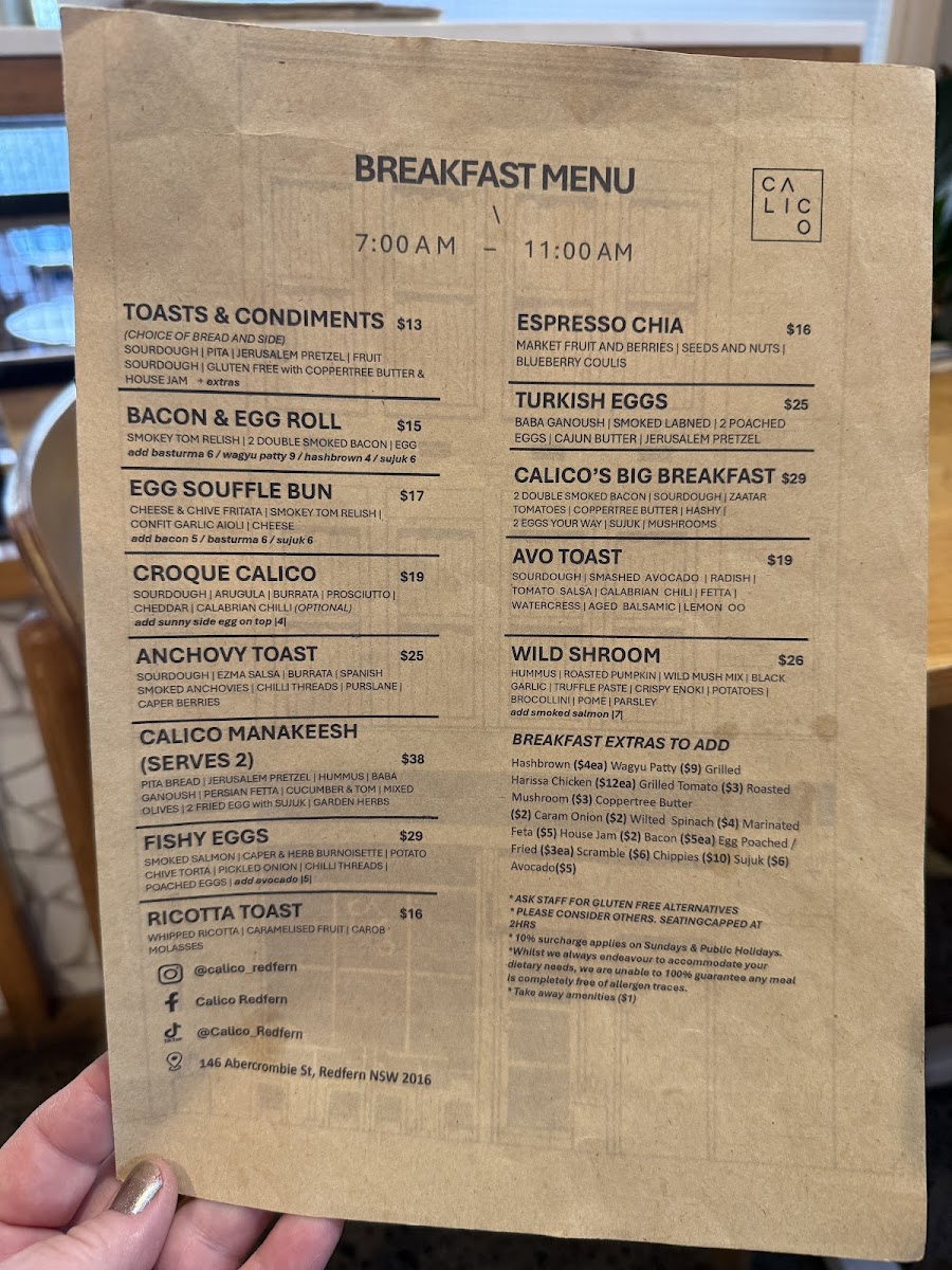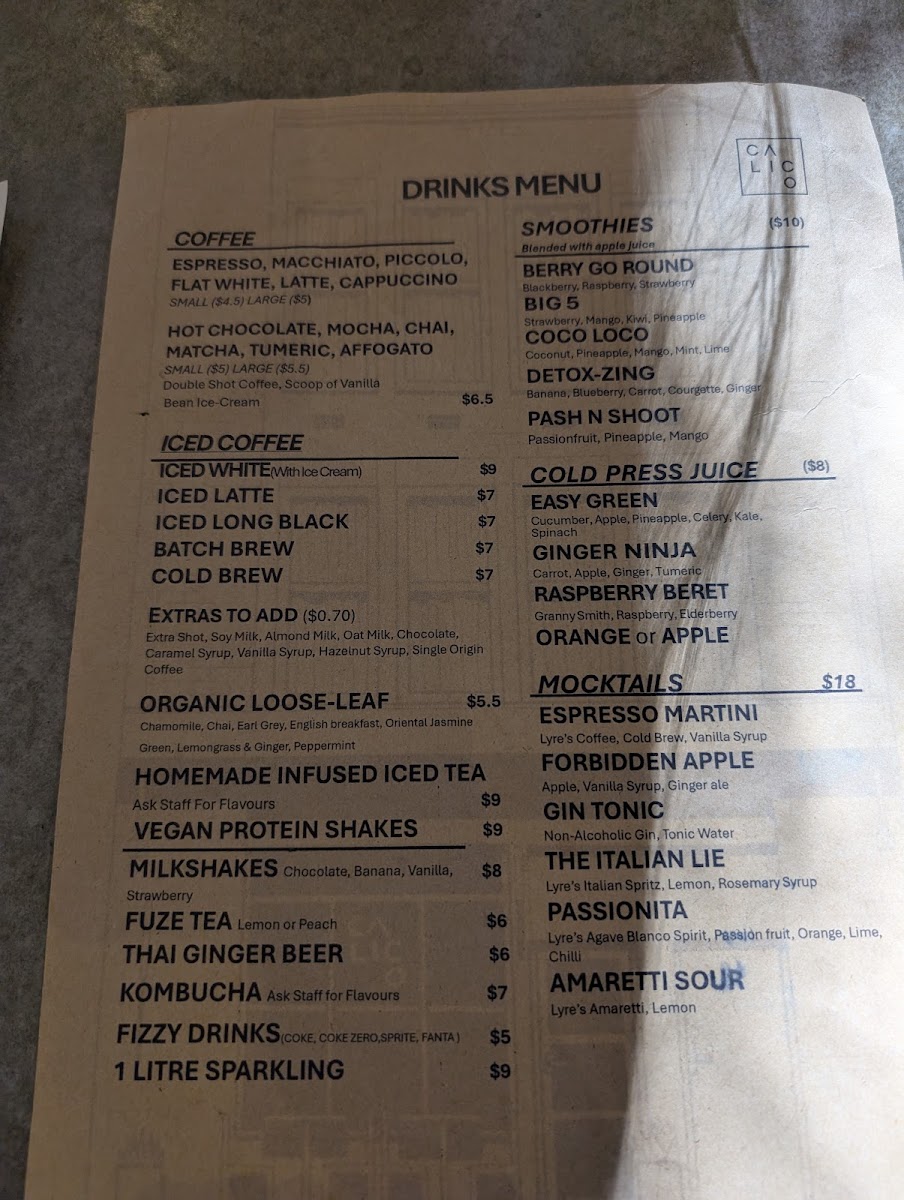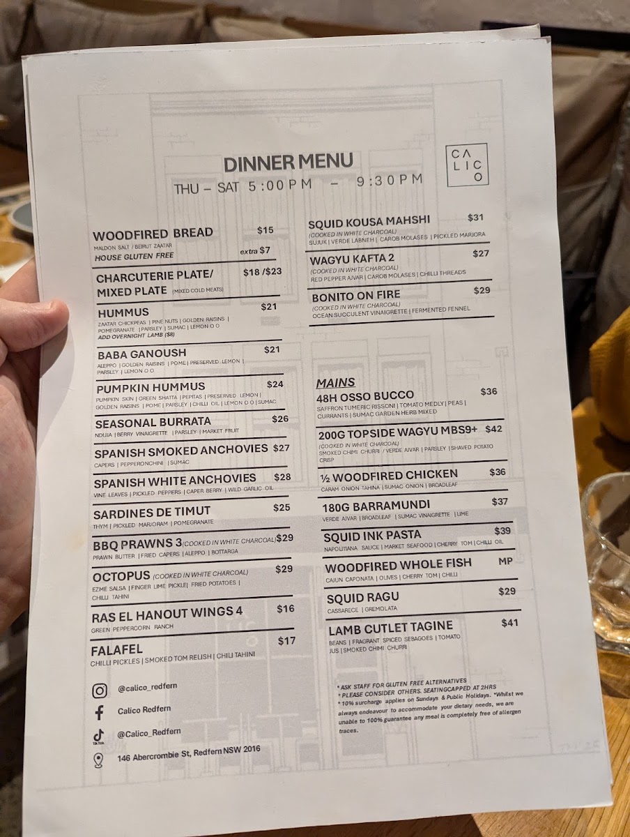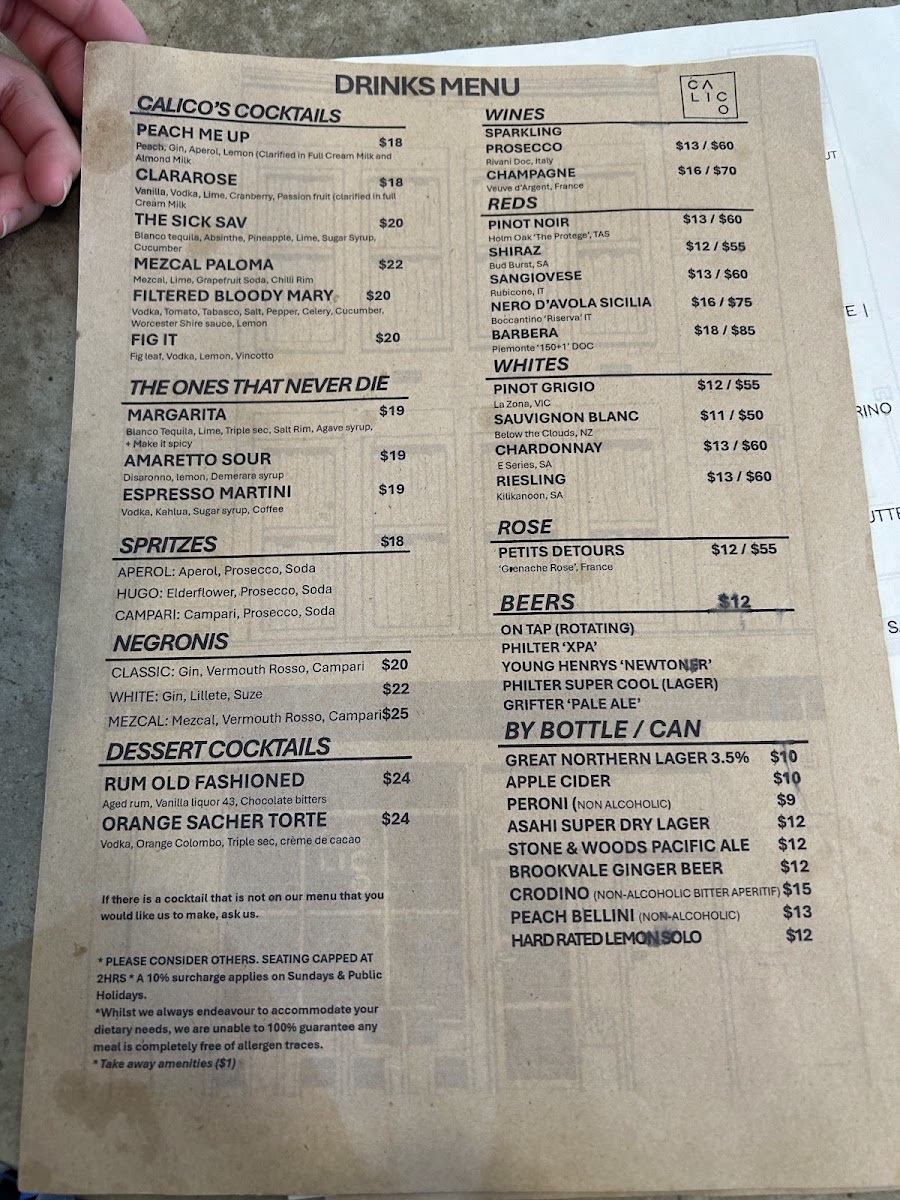 From starters to mains, Calico’s menu impresses with a delightful range of vibrant options that celebrate woodfired and fresh flavours. At lunch, guests can enjoy Woodfire Bread, Fresh Charcuterie Slices, and house dips alongside creamy Burrata and succulent King Prawns, followed by veggie highlights like Wild Shroom, Greek, Fattoush, Cauliflower, and Broccolini. The woodfired pizzas - Margherita, Diavola, Capricciosa, BBQ Chicken, and Prosciutto - offer classic and bold toppings, while desserts such as Burnt Cheesecake, Crème Caramel, Tiramisu, Knafeh, and Ice Cream by Scoop provide a sweet finish. Breakfast features hearty choices like Israeli Pita Bread, Sourdough, Jerusalem Bagel, Fruit Toast, and a Smoked Salmon Plate, with extras like Grilled Tomato and Roasted Mushroom to customise your meal. Takeaway options include the Smoked Tuna Roll, Mortadella Buffalo Roll, Ham Cheese Croissant, and Ham Cheese Toastie. Dinner returns to shareable starters like Hummus, Pumpkin Hummus, Baba Ganoush, and Taramasalata, leading into mains such as Chicken Baharat, Lamb Shoulder, Woodfired Whole Fish (Barramundi), 24‑Hour Lamb Ragu, and a Lamb Cutlet Plate, rounding out a menu that feels both thoughtfully curated and full of character.